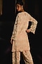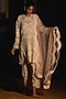 Featuring a pink kurta in crepe base with cutdana and pearls embroidery. It is paired with embroidered salwar pants and an organza scalloped embroidered dupatta. Accentuate it with delicate jhumkas and traditional juttis for an elegant touch, perfect for festive gatherings, family functions and daytime celebrations.