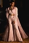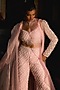 Featuring a powder pink jacket in organza base with embroidery. It is paired with a chiffon bustier having pearl and cutdana embroidery, including embroidered sharara pants. Accentuate it with sleek heels and minimal jewellery for a chic Indo-western vibe, perfect for cocktail parties and evening events.