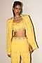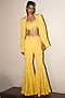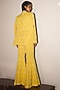 Featuring a yellow jacket in modal crepe base with sequins, cutdana and crystal embroidery. It is paired with a bustier and embroidered sharara pants. Accentuate it with sleek heels and minimal jewellery for a chic Indo-western vibe, perfect for cocktail parties, Haldi ceremony and evening events.