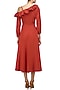 Featuring a flamingo orange strappy cascade yoke retro midi dress in blended cotton base with ruffled neckline and pleated flare.