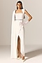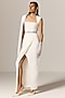 Featuring an ivory cape gown in crepe twill base with a wide neckline and high-slit. It is paired with a belt. Accentuate it with dangler earrings, a clutch and block heels for a complete look.