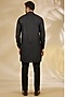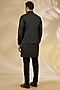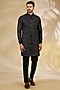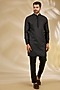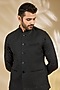 Featuring a black bundi jacket in ruby silk base with print. It is paired with a kurta and pants. Style it with mojaris for wedding, engagement or sangeet ceremonies.