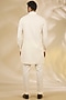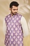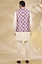 Featuring a purple bundi jacket in art silk base with print. It is paired with a ruby silk kurta and churidar pants. Style it with mojaris for wedding, engagement or sangeet ceremonies.
