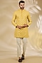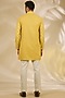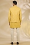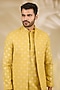 Featuring a yellow bundi jacket in ruby silk base with mandala print. It is paired with a kurta and beige pants. Style it with mojaris for wedding, haldi, engagement or sangeet ceremonies.