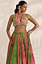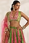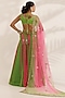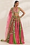 Featuring a fluorescent pink and lime green kalidar lehenga in satin georgette and shantoon base with bandhani print. It is paired with an hand embroidered blouse and a net dupatta having mirror work. Accentuate it with dangler earrings and heels for a sangeet, cocktail or engagement ceremony.