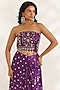 Featuring a purple draped skirt in silk satin base with bandhani print. It is paired with a raw silk satin hand embroidered blouse . Accentuate it with dangler earrings and heels for a sangeet, cocktail or engagement ceremony.