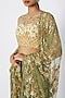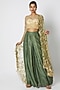 Featuring a gold sheer crop top in polyester base with applique embroidery. It is paired with a contrasting olive green box pleated trousers in cotton silk base and dupatta having sequins floral embroidery.