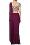 Featuring a violet drape saree in silk jersey with pearls, sequins, crystals and beads hand embroidery. It is paired with matching blouse with floral motif hand embroidery all over the bodice.