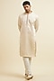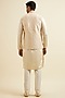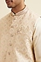 Featuring a beige nehru jacket in art silk and satin base with sequins, thread and zardosi embroidery. It is paired with a kurta, pyjama pants, a pocket square and a brooch. Perfect attire for an engagement ceremony, exuding traditional charm and timeless elegance.