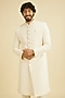 Featuring a cream sherwani in art silk base with sequins and thread embroidery. It is paired with pyjama pants and a pocket square. Perfect attire for a wedding or festive ceremony, exuding traditional charm and timeless elegance.