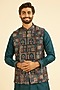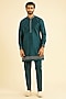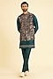 Featuring a teal blue indowestern jacket in art silk base with sequins embroidery. It is paired with a kurta and churidar. Perfect attire for a wedding or sangeet ceremony, exuding traditional charm and timeless elegance.