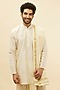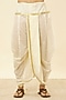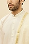 Featuring a warm white kurta in art silk and silk base with embroidery and pearl buttons. It is paired with a stitched dhoti having a gold zari border and a stole. Perfect attire for a pre-wedding ceremony, exuding traditional charm and timeless elegance.