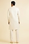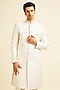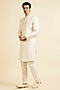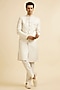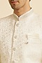 Featuring a white sherwani in brocade base with stone and cutdana hand embroidery. It is paired with pyjama pants, a pocket square and a brooch. Perfect attire for a wedding or festive ceremony, exuding traditional charm and timeless elegance.