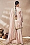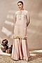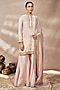 Masaba features a mesmerizing Baby Pink Sharara Set that captivates with its elegance. The eye-catching kurta is crafted in raw silk with a mandarin collar, full sleeves, foil print, embroidered border and placket detailing. It is paired with sharara pants having embellished border, including an organza dupatta having print and kinari embroidered border. Accentuate it with statement gold or antique jewellery and mojris for an elevated look.