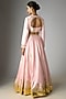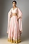 Featuring a baby pink lehenga in viscose slub base with an attached can-can, foil printed kalis, gota embroidery, side zip and pockets detailing. It is paired with a printed blouse having a V-neckline and organza dupatta having embroidered borders.Style this designer lehenga set with emerald jewellery, block heels, a floral hairdo and a potli bag for a perfect bridesmaid look.