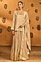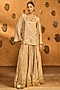 Masaba presents a mesmerizing beige kurta in raw silk base with placement foil print, patchwork embellishment and a V-neckline. It is paired with a foil print A-line crushed skirt having gold gota embellishment and an organza printed dupatta. Elevate the look with statement jhumkas, embellished heels, a potli bag and a sleek bun for opulent weddings or sangeet ceremonies.