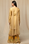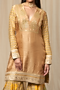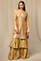 Featuring a beige kurta in raw silk base with aari embroidery. It is paired with matching gharara pants having wallflower print and a soft tulle choker embroidered dupatta.