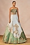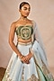 Masaba presents a blue and green lehenga in raw silk base with mithi makaai, kashmiri kali and paankh-bagh motif embroidery. It is paired with an embroidered corset blouse, a can-can, a sheer organza dupatta having patchwork and a net veil. Elevate this regal lehenga with kundan jewellery, a sleek bun adorned with fresh flowers and dewy makeup for a timeless bridal look.