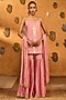 Masaba presents a mesmerizing champagne pink kurta in raw silk base with foil printed motifs. It is paired with sona chandi foil work sharara pants and a sheer organza dupatta. Enhance your style by embracing ornate chandbalis, lustrous metallic heels, soft curls and a clutch to evoke festive grandeur.