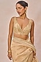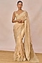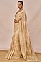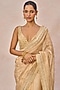 Featuring a gold and ivory saree in tissue base with gul jharokha motif embroidery. It is paired with an embroidered blouse. Elevate the look with kundan or statement jewellery, paired with a chic potli bag and elegant heels for a polished finish. Ideal for weddings, sangeet celebrations, cocktail soirees, or festive receptions.