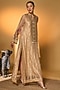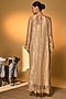 Featuring a gold kaftan in tissue base with gota embroidered yoke and foil print. It is paired with a crepe silk slip. Accentuate it with heels and statement jewellery for a festive occasion.