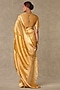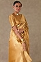 Masaba showcases a golden yellow saree in tissue base with zari and anar border detail. It is paired with a blouse. Style with polki earrings, soft curls and heels for festive occasions or pre-wedding ceremonies.