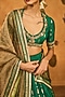 Featuring a green crushed lehenga in raw silk base with an attached can-can, totem line foil print and gota detail at the hem. It is paired with an embroidered blouse and a shimmer tissue dupatta. Accentuate it with kundan or zircon jewellery, block heels and a box clutch for a wedding, cocktail, mehendi or reception ceremonies.