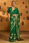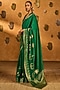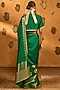 Featuring a green saree in woven jacquard silk base with an embroidered borders. It is paired with a raw silk unstitched blouse fabric. Accentuate it with swarovski or pearl jewellery, block heels and a box clutch for daytime weddings, mehendi or sangeet nights.