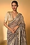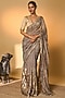 Featuring a grey saree in raw silk and zari striped tissue base with motif foil print and lace detailing. It is paired with a raw silk unstitched blouse piece having motif embroidery and foil detailing. Accentuate it with traditional kundan polki jewellery, a classic potli bag and elegant heels for a stylish ensemble, ideal for wedding ceremonies, festive occasions or grand family celebrations.