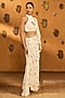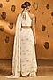Masaba presents a mesmerizing ivory pre-stitched saree in crepe silk base with foil print, sequins and dori embroidery. It is paired with a gold motif embroidered blouse. Elevate the look with statement jhumkas, embellished heels, a potli bag and a sleek bun for opulent weddings or sangeet ceremonies.