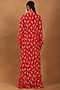 Featuring a maroon wrapped maxi dress in crepe base with lapels, tie-up detail, frilled asymmetrical hemline, and print.