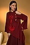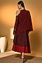 Featuring a maroon asymmetrical top in crepe silk base with patchwork, cold shoulder, bell sleeves, tie-up and tassels detail. It is paired with a circle skirt having tonal patti and side seam zipper closure. Style this skirt set with sleek flats, a tote bag and an oversized sunglasses, perfect for rooftop lunches.