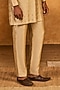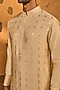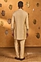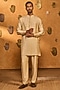 Featuring a beige kurta in raw silk base with a mandarin collar, pockets, concealed placket and foil print. It is paired with straight pants. Style it with mojaris and malas for a festive occasion, wedding, sangeet or engagement ceremony.