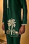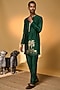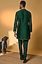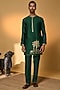 Featuring a green kurta in chanderi base with a mandarin collar, pocket detailing, concealed placket, gold embroidery, and tropical nandi print. It is paired with chanderi straight pants having pockets. Style it with mojaris and malas for a festive occasion, mehendi, wedding, sangeet or engagement ceremony.