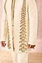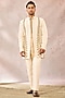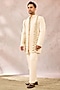 Featuring an ivory koti in heavy raw silk base with pearl work, cutdana and zardosi embroidery. It is paired with straight pants and a georgette tissue kurta. Perfect wear for a wedding or engagement ceremony.
