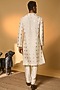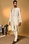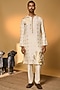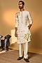 Featuring an ivory kurta in raw silk base with a mandarin collar, pocket detailing, concealed placket, and foil print. It is paired with raw silk straight pants having pockets. Style it with mojaris and malas for a festive occasion, haldi, wedding, sangeet or engagement ceremony.
