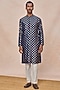 Featuring a navy blue kurta in raw silk base with a mandarin collar, pocket detail, concealed placket and foil print. It is paired with straight pants having pockets. Style it with mojaris for a festive occasion, intimate pooja, wedding or engagement ceremony.