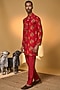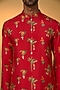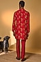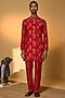 Featuring a red kurta in raw silk base with a mandarin collar, pocket detailing, concealed placket, and digital print. It is paired with raw silk straight pants having pockets. Style it with mojaris and malas for a festive occasion, wedding, sangeet or engagement ceremony.