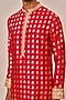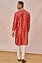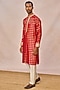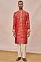 Featuring a red kurta in raw silk base with a mandarin collar, pocket detail, concealed placket and foil print. It is paired with cotton silk straight pants having pockets. Style it with mojaris for a festive occasion, intimate pooja, wedding or engagement ceremony.