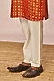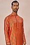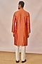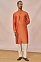 Featuring a rust kurta in raw silk base with a mandarin collar, pocket detail, concealed placket and foil print. It is paired with cotton silk straight pants having pockets. Style it with mojaris for a festive occasion, intimate pooja, wedding or engagement ceremony.