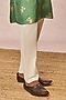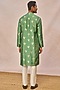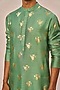 Featuring a sage green kurta in raw silk base with a mandarin collar, pocket detail, concealed placket and foil print. It is paired with cotton silk straight pants having pockets. Style it with mojaris for a festive occasion, intimate pooja, wedding or engagement ceremony.