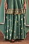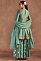 Featuring a moss green short anarkali in raw silk base with kinari and border embellishments. It is paired with foil printed sharara pants and an organza dupatta. Accentuate this sharara set with mojaris and stud earrings for wedding ceremony.