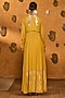 Masaba presents a mesmerizing ochre yellow jacket in georgette base with ombre foil printed and gota line detail. It is paired with a raw silk ombre foil printed kurta having banarasi jacquard yoke detail and pants. Elevate your haldi ceremony ensemble with dangler earrings, block heels and a clutch for a sophisticated look.