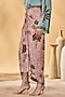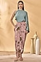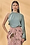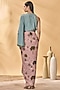 Masaba presents a blue one-shoulder top in crepe silk base with a bell sleeve and trellis palm patchwork. It is paired with a pink draped printed skirt. Accentuate it with dangler earrings, a sling bag and heels for evening soirees.