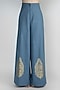 Featuring a pink and green high-low crop top in chanderi base with savannah digital print. It is paired with contrasting palazzo pants in denim base having gold foil detailing and poly crepe bustier.