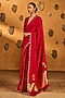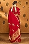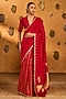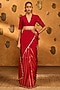 Masaba presents a pink saree in raw silk base with a crushed pallu, dawn crane and foil print. It is paired with an unstitched printed blouse fabric having gota detailing. Accentuate it with polki choker necklace, kolhapuri heels and a clutch bag for a festive look, family gathering or pooja ceremony.