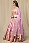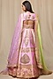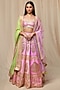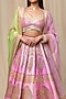 Featuring a pink lehenga in pure raw silk base with embellishments and wallflower print. It is paired with a matching bustier, a shrug having sequins work and a pair of organza dupattas having embroidered borders.