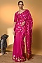Featuring a rani pink saree in raw silk base with chand phool foil print and gota applique embroidery. It is paired with a raw silk pinstripe blouse piece having turtle tale motifs. Accentuate it with statement jewellery and wedges for weddings or sangeet ceremonies.