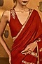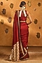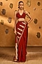 Masaba presents a mesmerizing red saree in raw silk base with applique and placement foil print. It is paired with an unstitched blouse. Elevate the look with statement jhumkas, embellished heels, a potli bag and a sleek bun for regal wedding ceremonies or a bridal look.