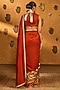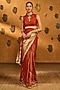 Masaba presents a mesmerizing rust saree in raw silk base with placement foil print. It is paired with an unstitched blouse piece. Elevate the look with statement jhumkas, embellished heels, a potli bag and a sleek bun for opulent weddings or sangeet ceremonies.